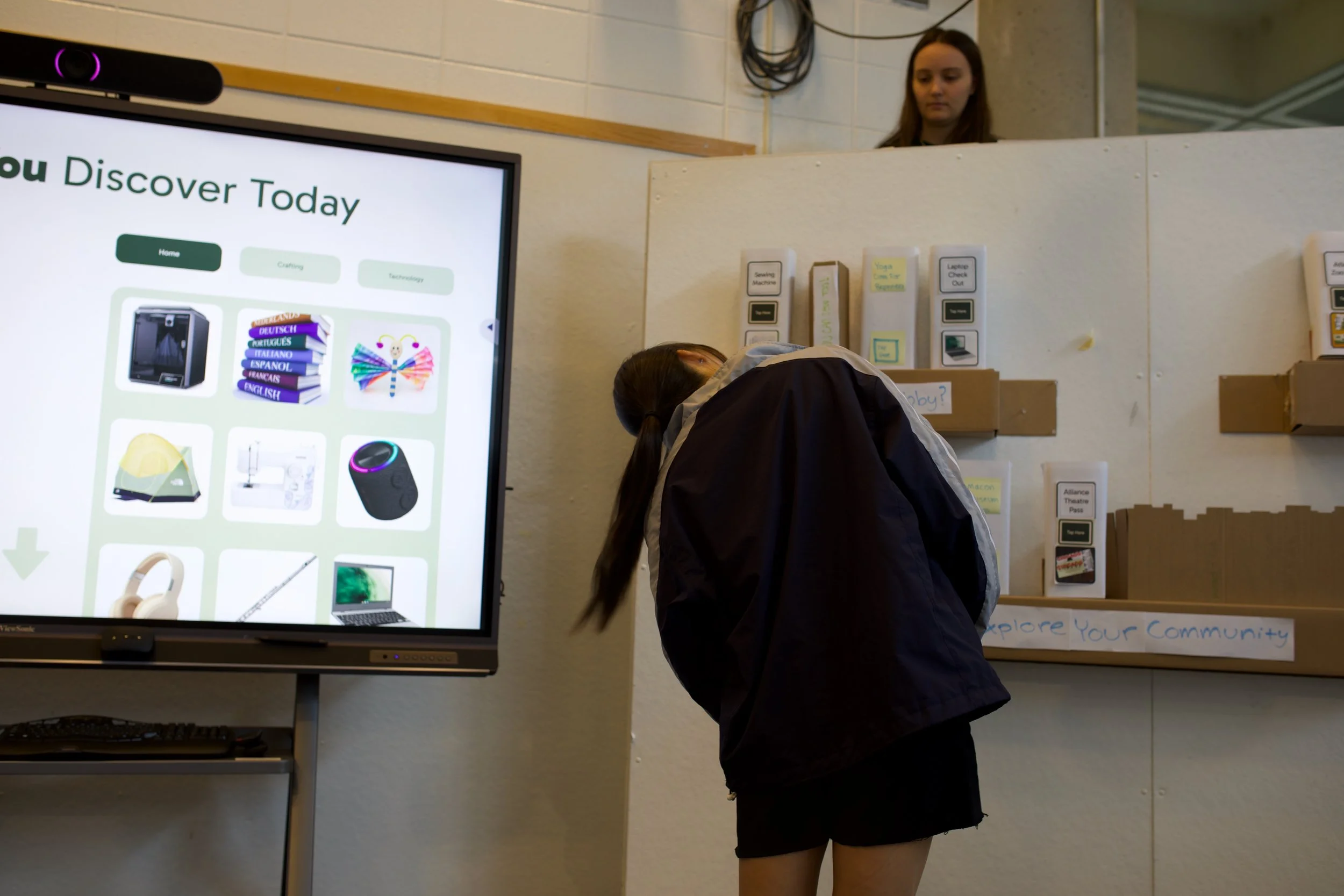Patrons are guided toward the resource board. The screen uses a familiar virtual browsing experience with descriptive signifiers that prompt patrons to interact with the board. It initially displays a default gallery view and includes additional search filters patrons can use to customize their browsing experience.